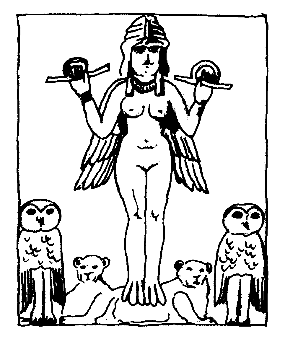 (Characters evoke sci-fi or reptilian alien design, not Akkadian divine form)