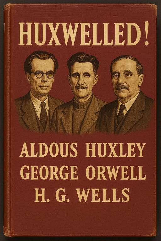 Huxwellism is a word I coined to describe the convergence of three distinct but overlapping visions of modern mass control. George Orwell revealed the mechanics of repression - surveillance, censorship, propaganda, and the enforced rewriting of memory. Aldous Huxley revealed the mechanics of sedation - the pharmacological pacification, cultural distractions, and engineered pleasures that make people accept their own servitude. H. G. Wells, in both fiction and non-fiction, mapped the horizon of technocracy and bifurcation: his scientific romances exposed class division carried into the future, the potentials of science gone awry, while his manifestos of world planning offered blueprints for centralised authority.